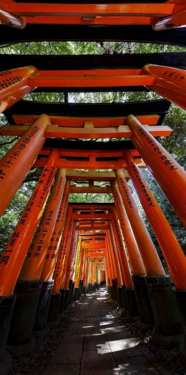 The seemingly endless “1000 Gates” of the Fushimi Inari Shrine go on for miles …and miles …and miles in a remarkable and artful presentation near Kyoto. You can almost walk into this image with the path nearly at your feet.