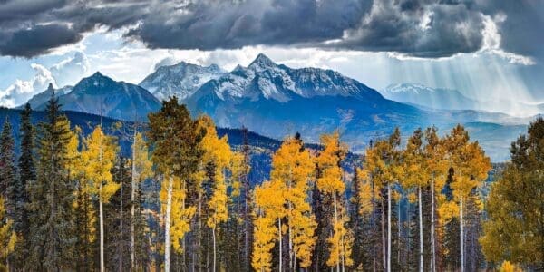 A majestic mountain peak is adorned with rays of sunlight after a Fall storm.