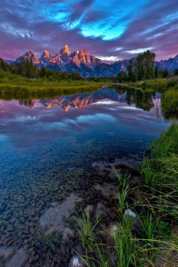 The Grand Tetons lit with the colors of the rising sun, reflected beautifully in a calm section of the Snake River.