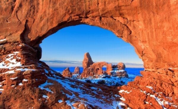 Turret Arch is beautifully framed by another arch in Arches National Park in Utah.